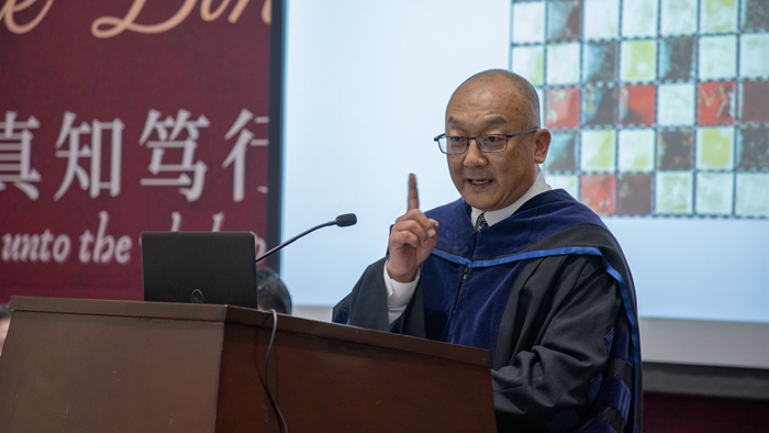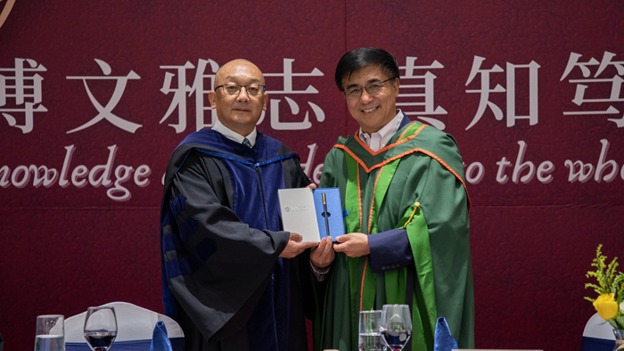 Other high table guests were Mr Wu Xiangming, Vice Director of Zhuhai Culture, Sports and Tourism Bureau; UIC President Professor Tang Tao; Vice President (Academic), Dean of Division of Science and Technology Professor Huang Huaxiong; Associate Vice President (Student Development) Professor Stella Cho; Associate Vice President (Internationalisation) and Dean of Division of Humanities and Social Sciences, Professor Adrian Bailey; Dean of Division of Culture and Creativity, Professor Holger Briel; and Dean of Division of Business and Management, Professor Liu Wenbin.